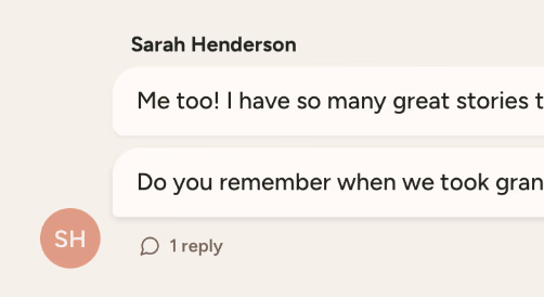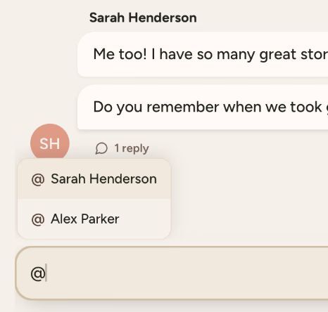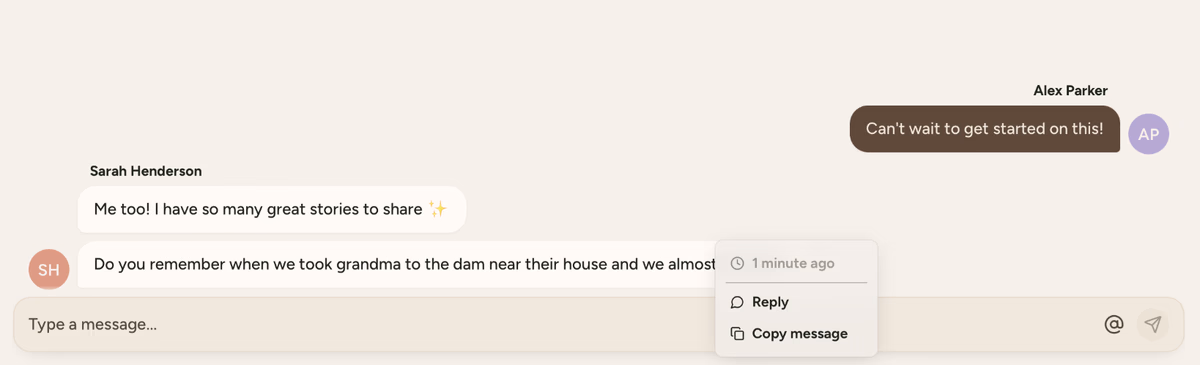 Group chat keeps everyone in sync. Perfect for coordinating who's writing what, sharing sudden memories, and celebrating each other's contributions as your project grows.