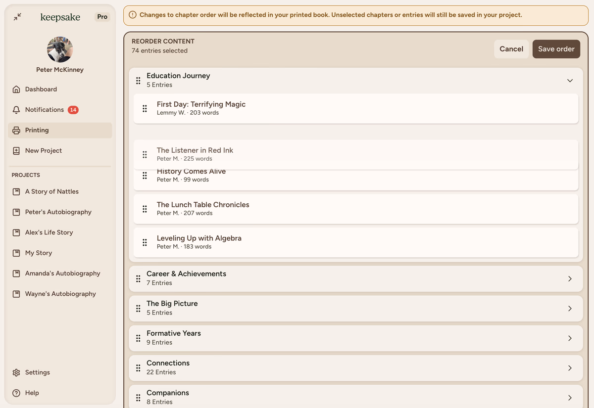 Changes to your content order will be reflected in your printed book. Make sure you're happy with the flow before saving.