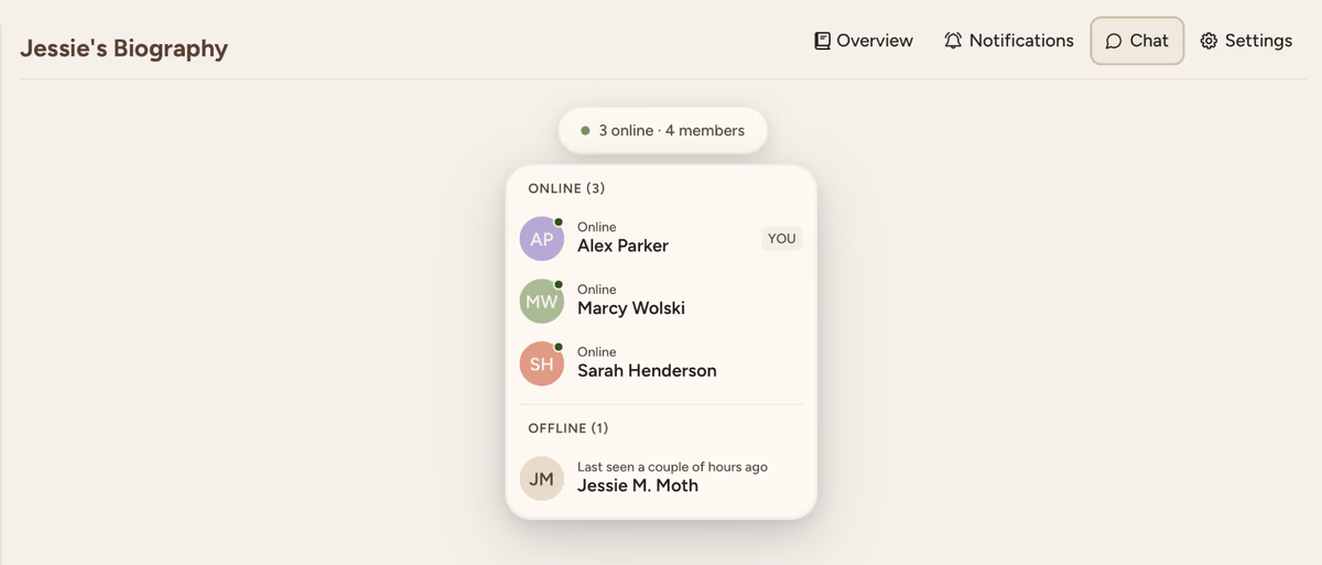 See who's online to coordinate real-time editing sessions or start group chats when everyone's present.