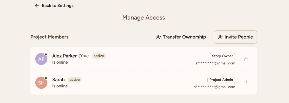 Track which collaborators are currently active in your project with real-time presence indicators for better coordination and collaboration